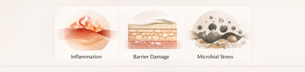 Treating these pressures separately does not work. The skin responds best when all three are addressed together, in one consistent routine.